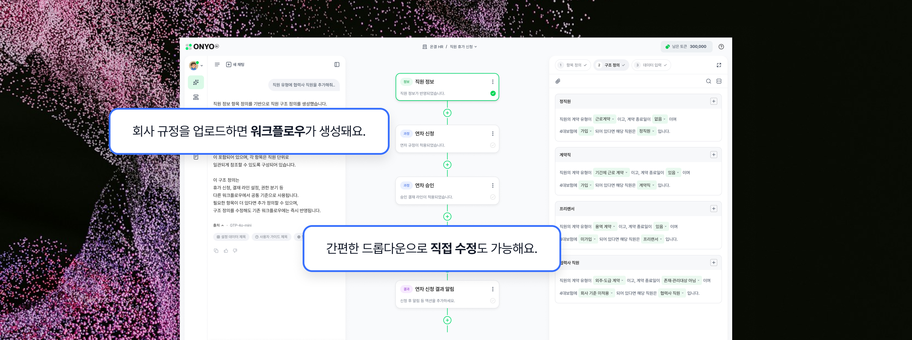 규정을 넣으면 ONYOAI가 승인 로직과 흐름을 자동으로 만듭니다.